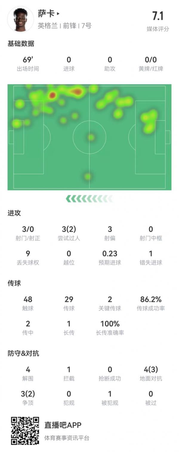 6月21日讯 英格兰在本轮欧洲杯暂时1-1战平丹麦,萨卡本场数据如下:
