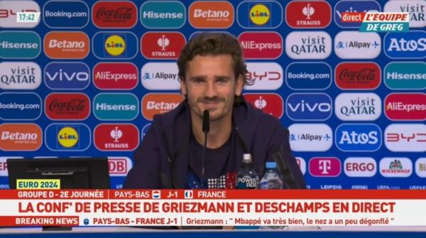 6月21日讯 法国队将在欧洲杯小组赛次轮迎战荷兰,赛前,格列兹曼出席新闻发布会。
