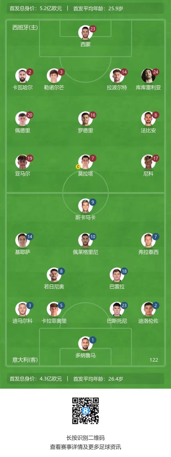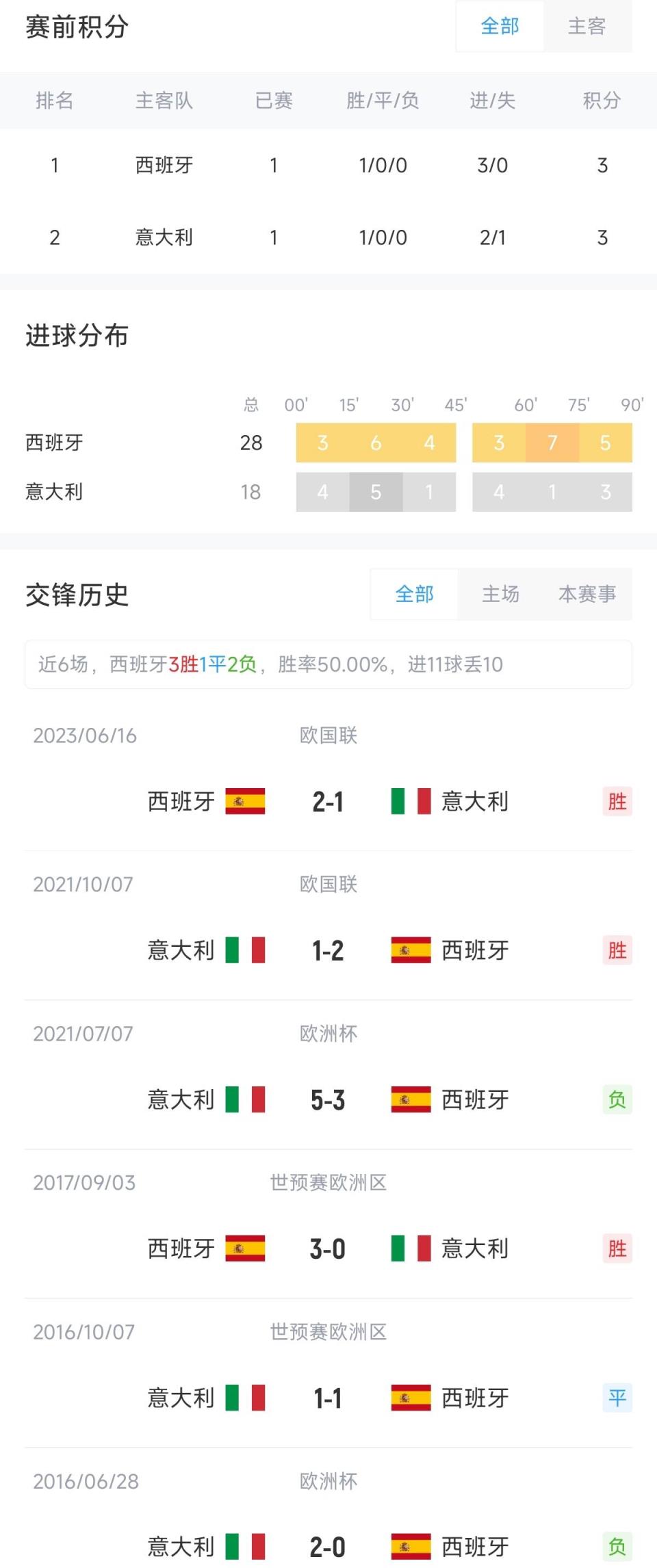 在小组赛首轮,西班牙3-0克罗地亚,意大利2-1阿尔巴尼亚。双方最近6次交手,西班牙3胜1平2负占据优势。最近的一次交手为去年的欧国联,当时西班牙2-1击败意大利。