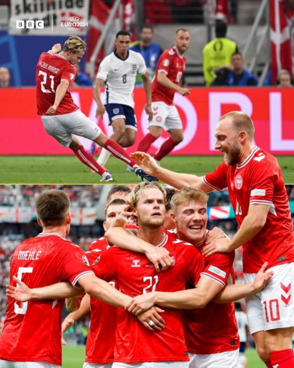 6月21日讯 欧洲杯小组赛C组第2轮,英格兰对阵丹麦,丹麦队尤尔曼德超远世界波扳平比分。