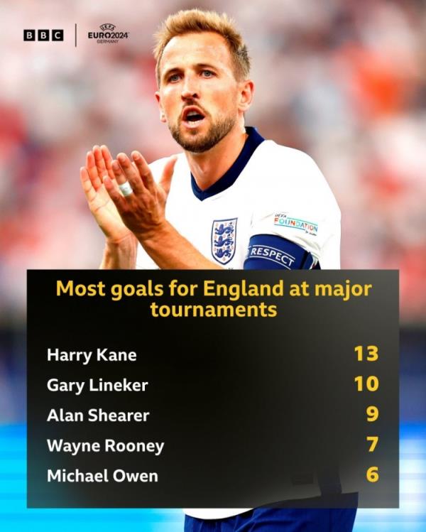 这是凯恩在大赛中的第13球(欧洲杯5球+世界杯8球),比英格兰队史第二莱因克尔多3球。