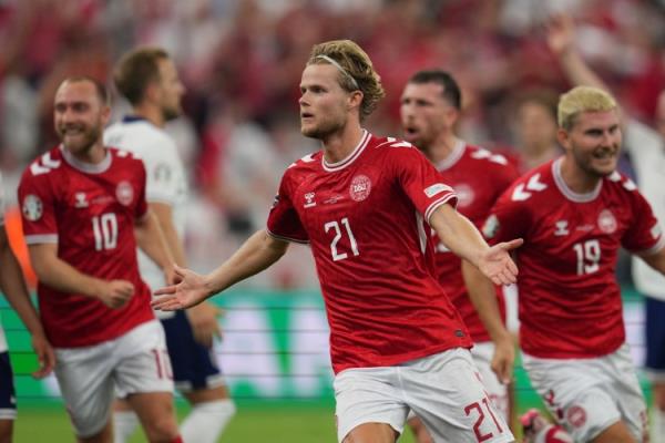 06月21日讯 欧洲杯小组赛C组第2轮,丹麦半场1-1英格兰,丹麦中场尤尔曼德轰出一脚28米世界波。