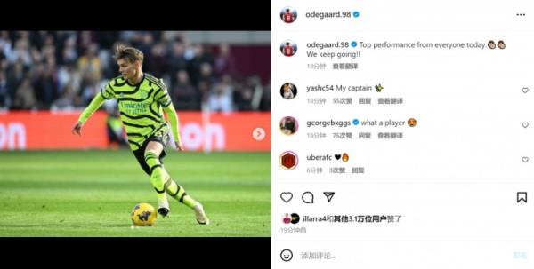 赛后,厄德高更新社媒,他晒出本场比赛的图片,并配文:“今天每个人都是顶级表现,我们继续前进!”