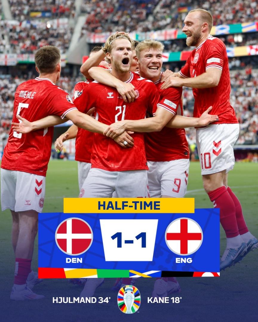 6月21日讯 北京时间6月21凌晨0点,2024年欧洲杯小组赛C组第2轮继续展开角逐,丹麦对阵英格兰的比赛将在法兰克福竞技场打响。上半场,凯恩左脚推射破门,随后尤尔曼德禁区外世界波远射破门,上半场比赛结束,英格兰1-1丹麦。