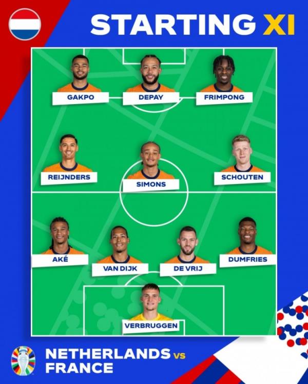 6月22日讯 欧洲杯小组赛D组第2轮,荷兰对阵法国,赛前双方公布首发。