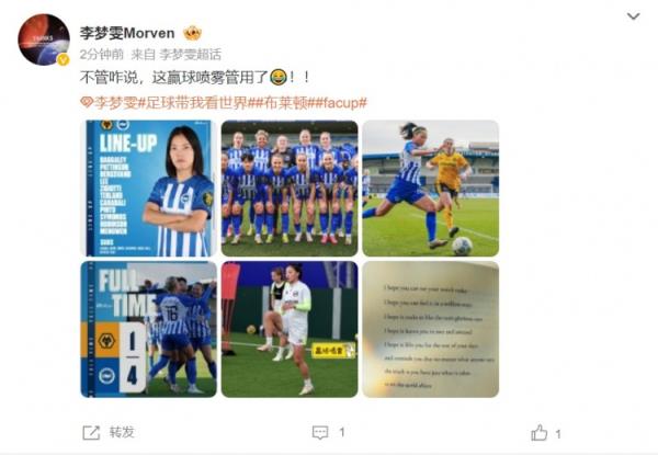 2月12日讯 中国女足球员李梦雯更新微博,庆祝布莱顿女足赢球。