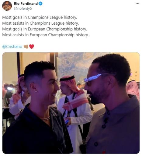 赛后,费迪南德发文列出C罗的纪录,他写道: