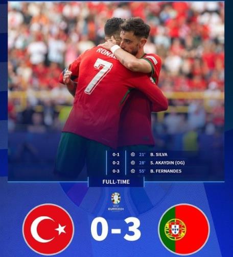 6月23日讯 葡萄牙在本轮欧洲杯3-0击败土耳其,也得以2连胜提前锁定小组头名。