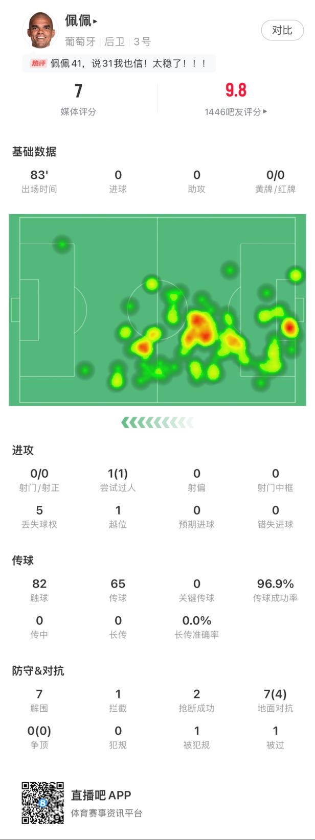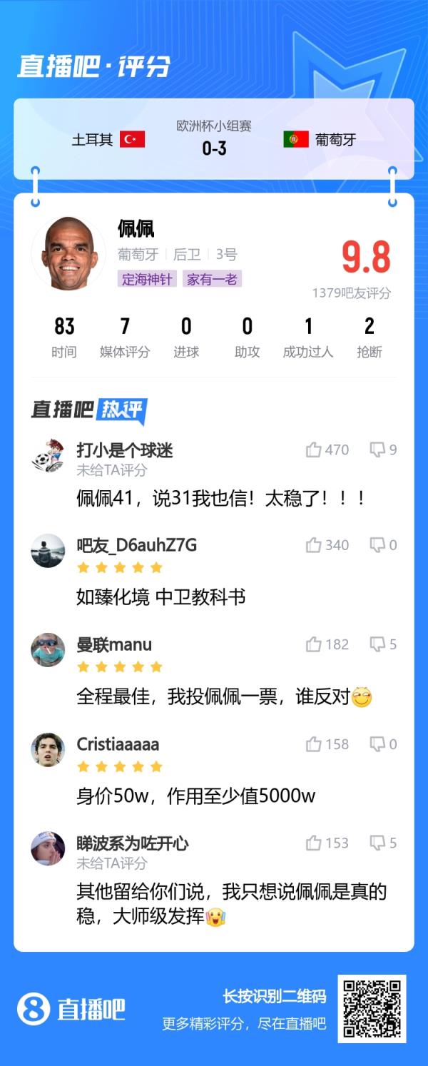 06月23日讯 欧洲杯F组第2轮,葡萄牙3-0完胜土耳其,锁定小组头名出线。41岁的葡萄牙中卫佩佩本场首发出战83分钟被换下,吧友为他出9.8的超高分。