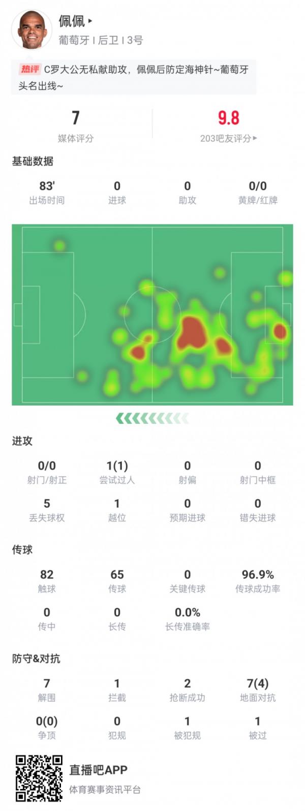 6月23日讯 欧洲杯小组赛F组第2轮,葡萄牙3-0击败土耳其,41岁佩佩第83分钟被换下,本场数据如下。