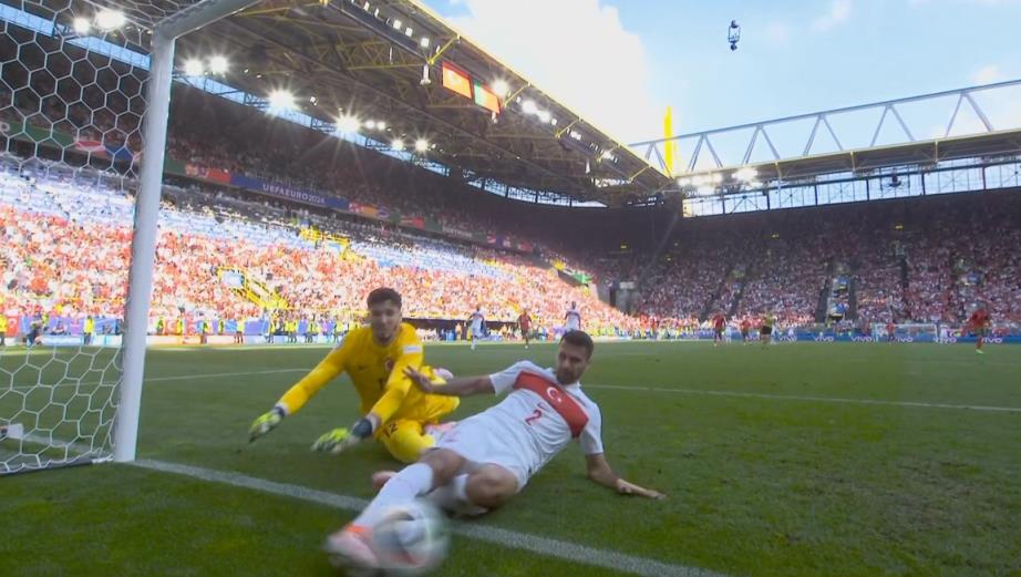 06月23日讯 葡萄牙vs土耳其第28分钟,土耳其后防离谱失误,自摆乌龙!皮球直接过线,主裁判直接指向中圈。