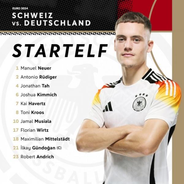 德国首发:1-诺伊尔、6-基米希、2-吕迪格、4-塔、18-米特尔施塔特、8-克罗斯、23-安德里希、10-穆西亚拉、17-维尔茨、21-京多安、7-哈弗茨