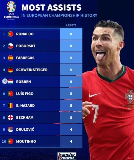 6月24日讯 葡萄牙在昨晚的欧洲杯小组赛第二轮3-0完胜土耳其,C罗无私助攻B费破门。数据统计显示,他也已经在欧洲杯助攻榜并列榜首。