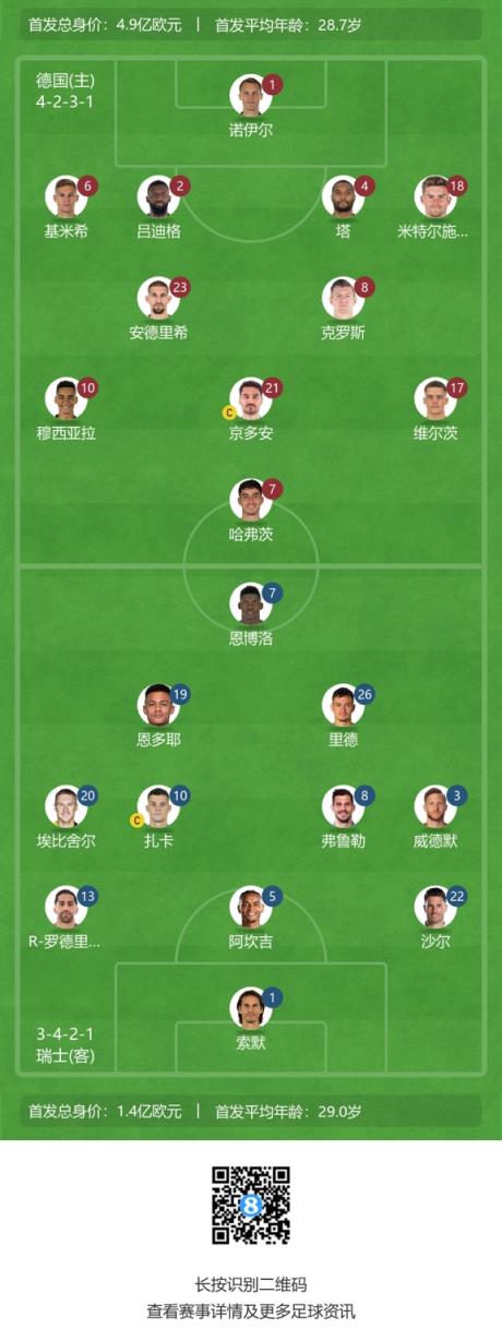 6月24日讯 欧洲杯小组赛A组第3轮,瑞士vs德国在法兰克福竞技场打响,比赛凌晨3:00开球,赛前首发名单公布。