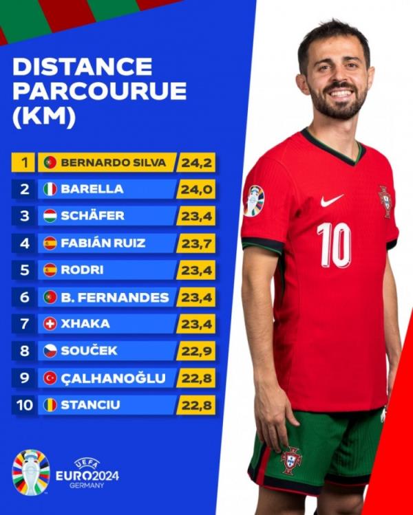 6月24日讯 本届欧洲杯第2轮小组赛战罢,欧足联官方统计了前2轮的跑动榜,B席、巴雷拉2轮狂奔24km排在前二。