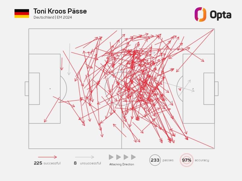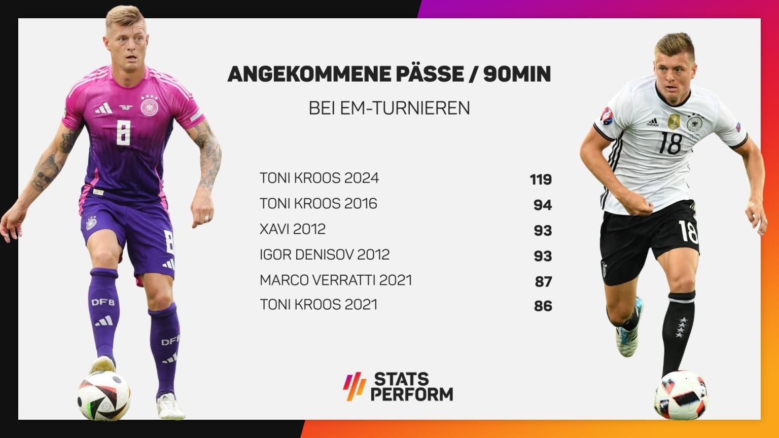 欧洲杯小组赛前两战,克罗斯均首发出战帮助德国队取得两连胜,而他本人平均每90分钟送出119次成功传球,位居中场球员历史最高(出场至少150分钟)。
