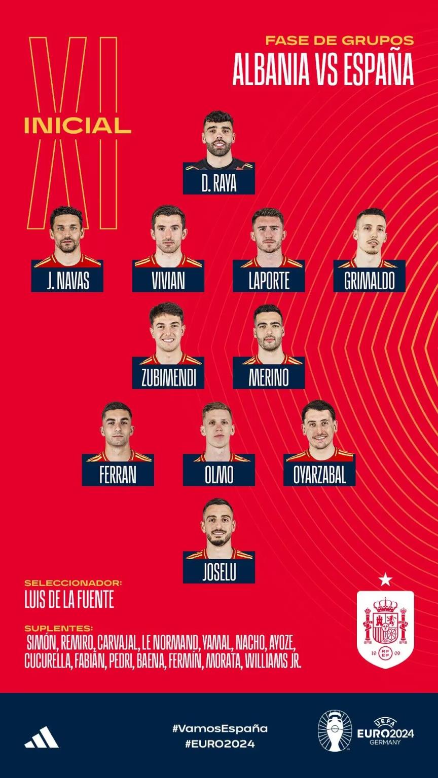 06月25日讯 欧洲杯小组赛B组第3轮,西班牙公布对阵阿尔巴尼亚首发。相比上一场对阵意大利,西班牙本场轮换10人,只有拉波尔特继续先发。