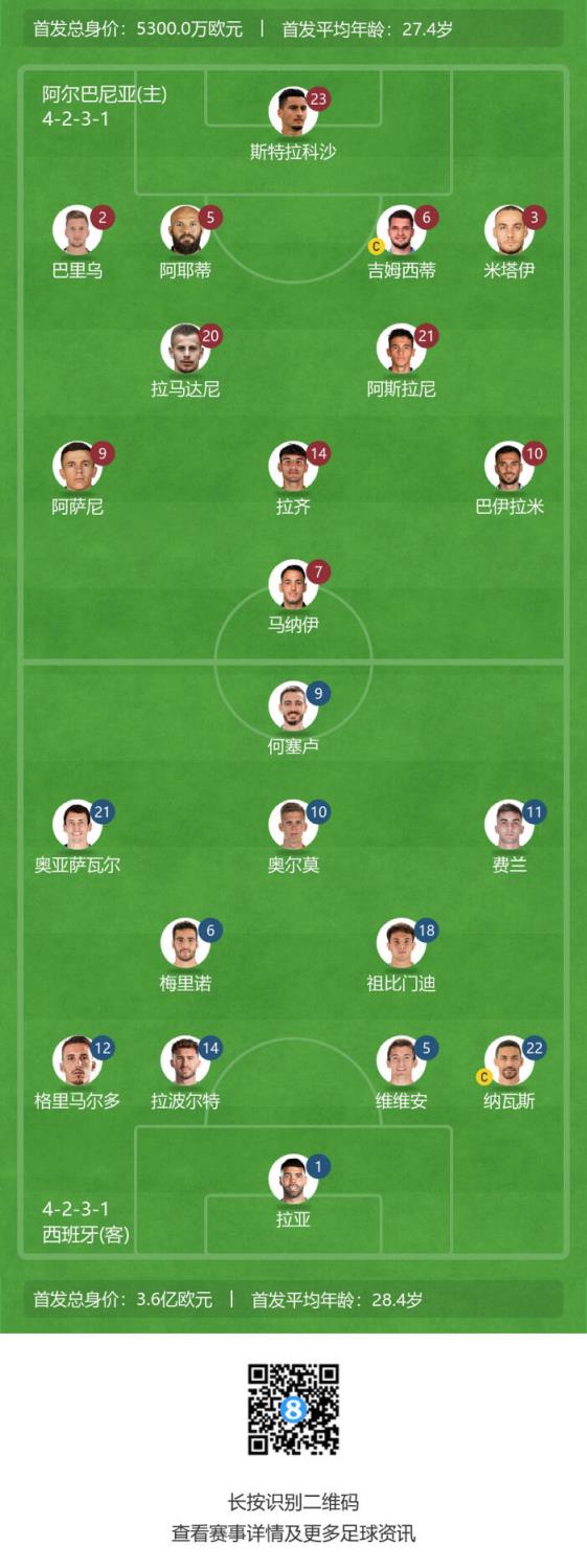 西班牙已经提前头名出线,罗德里本场停赛,卡瓦哈尔和勒诺尔芒本场若染黄下场需停赛。阿尔巴尼亚目前1分暂排第三,想出线需全力争胜。