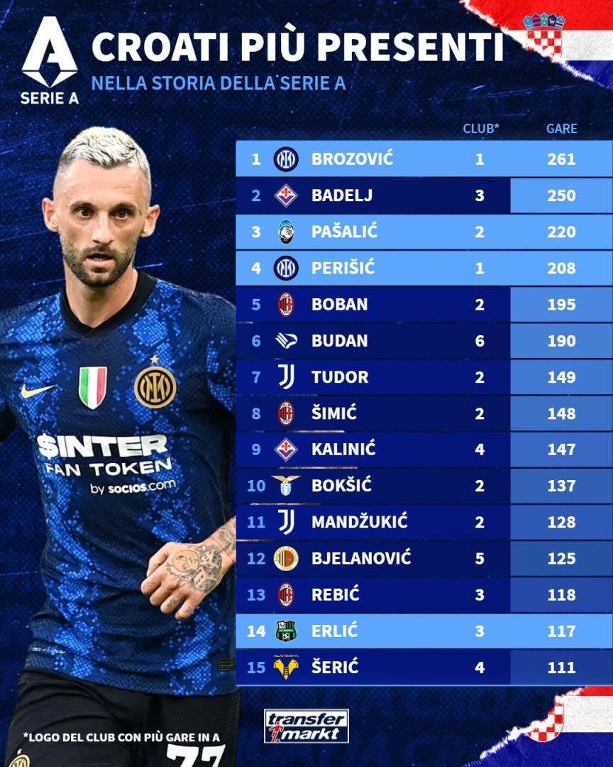 6月25日讯 意大利将在本轮欧洲杯对阵克罗地亚。《转会市场》统计了克罗地亚球员在意甲出场情况,B罗261场居首。