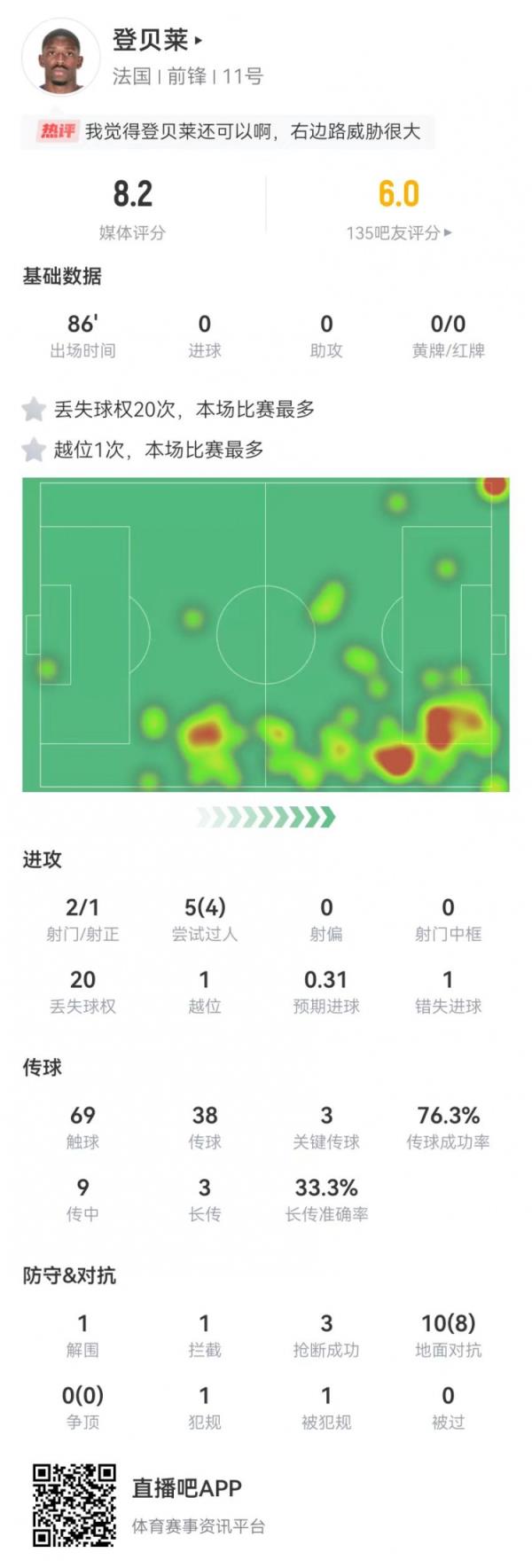 6月26日讯 法国在本轮欧洲杯1-1战平波兰,登贝莱本场数据如下: