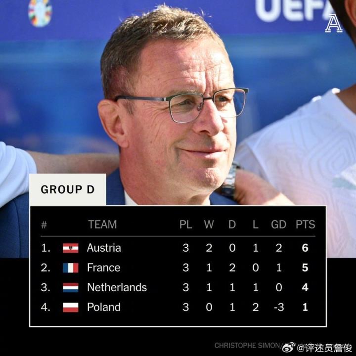 欧洲杯D组比赛全部结束,末轮比赛,奥地利3-2荷兰,法国1-1波兰。詹俊对比赛进行了点评。