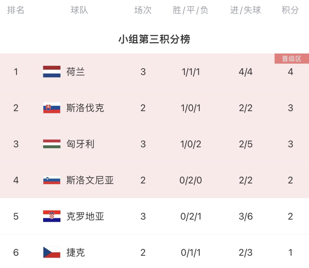 已结束的三个组中,D组第三荷兰成绩优于A组第三匈牙利和B组第三克罗地亚,荷兰确定出线。