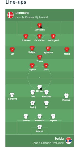 6月26日讯 北京时间6月26日凌晨0:00,欧洲杯小组赛C组第3轮,丹麦vs塞尔维亚的比赛将在慕尼黑球场打响,赛前双方公布首发阵容。