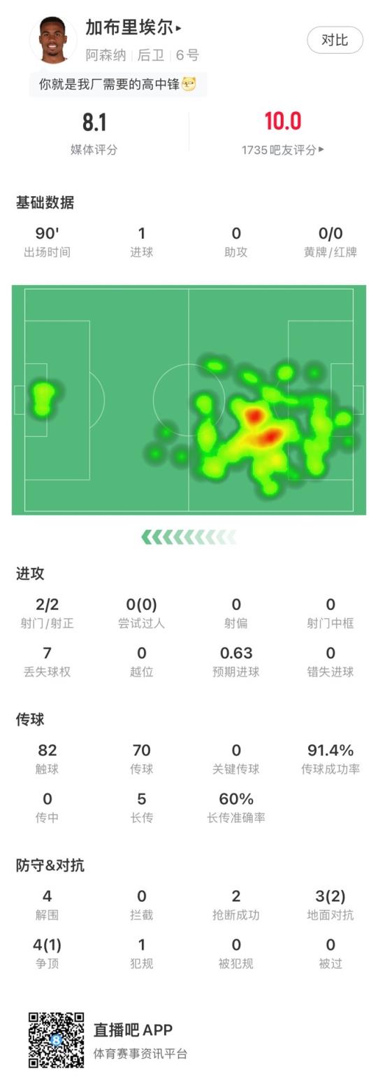 2月12日讯 阿森纳本轮6-0大胜西汉姆,加布里埃尔打进1球,赛后获评8.1分。