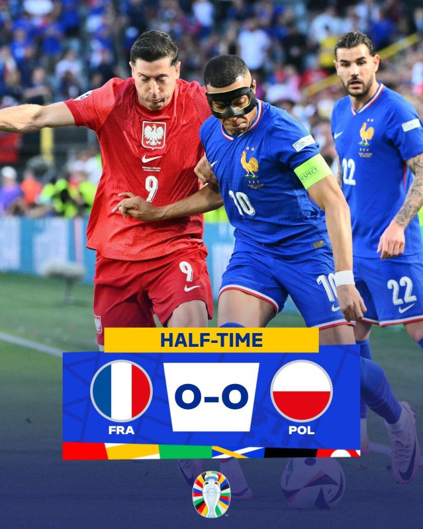 6月26日讯 北京时间6月26日凌晨0:00,欧洲杯小组赛D组第3轮,法国对阵波兰。上半场两队均无建树,登贝莱和莱万都有很好的机会没把握住,法国暂0-0波兰。