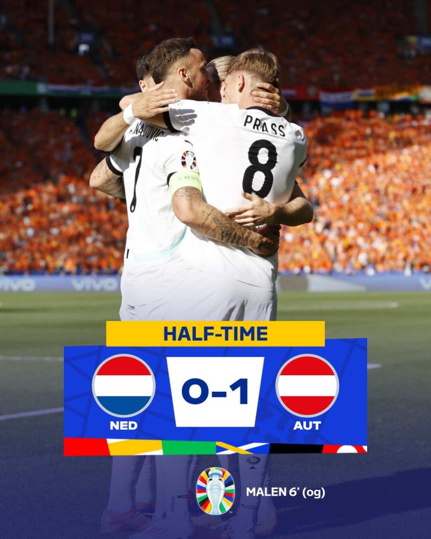 6月26日讯 北京时间0:00,欧洲杯小组赛D组第3轮荷兰vs奥地利。上半场,马伦回防“铲射”攻破自家大门,随后又失单刀;德佩头球中柱。半场结束,荷兰暂0-1落后奥地利。