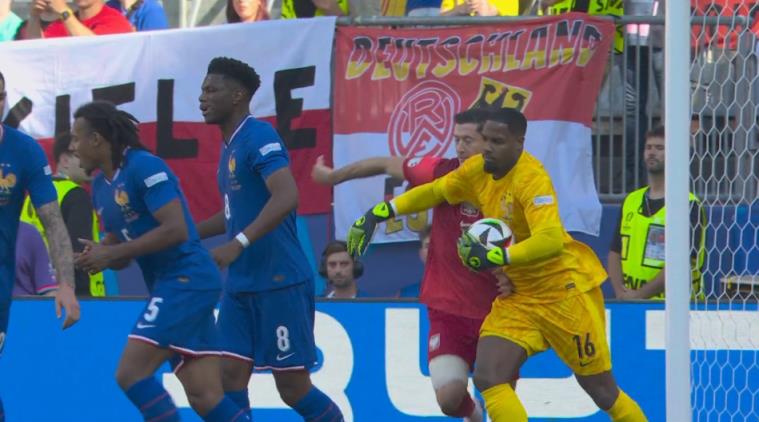 比赛第14分钟,迈尼昂抱住波兰队射门,莱万上前干扰迈尼昂开球,两人发生身体接触后双双摔翻在地。
