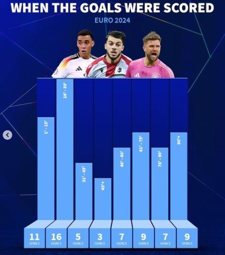 6月26日讯 《转会市场》统计了本届欧洲杯进球时间段情况,16-30分钟最多。