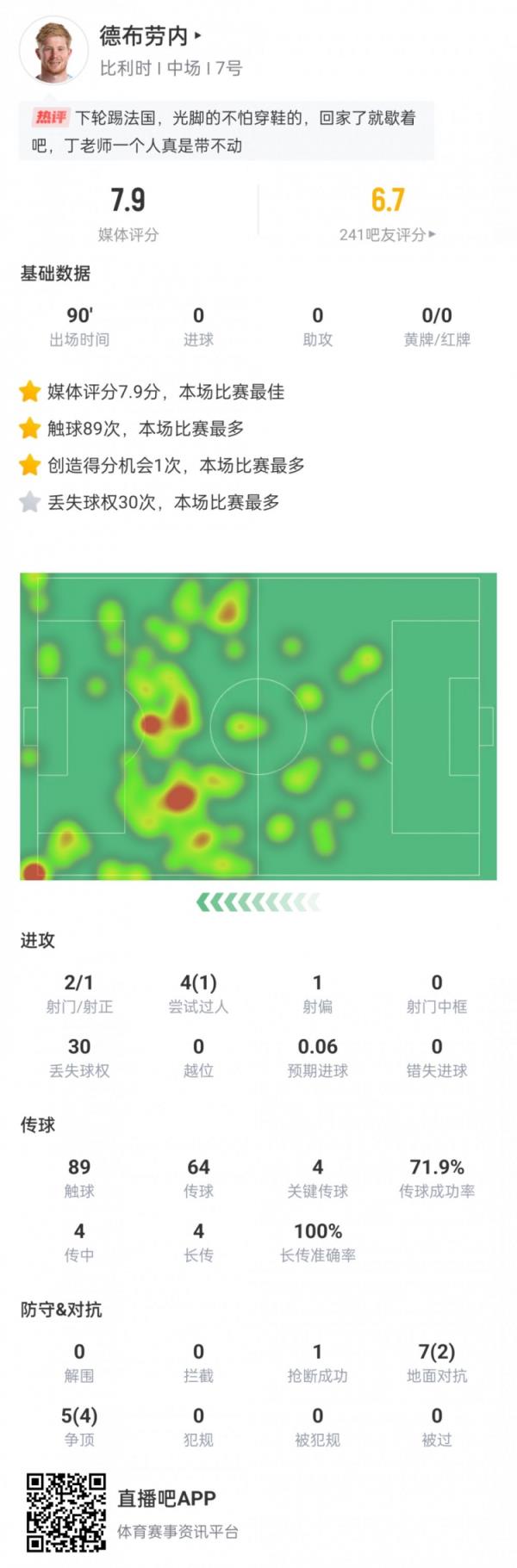 相关阅读:德布劳内本场数据:4关键传球+30丢失球权 12对抗6成功 获评7.9分