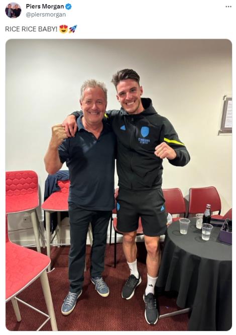 2月12日讯 英超第24轮,阿森纳客场6-0血洗西汉姆。本场比赛,战旧主的赖斯表现出色,打进1球、助攻2次。赛后,英国名嘴、知名枪迷皮尔斯-摩根再次晒出和他的合照,表达对这名新援的喜爱。