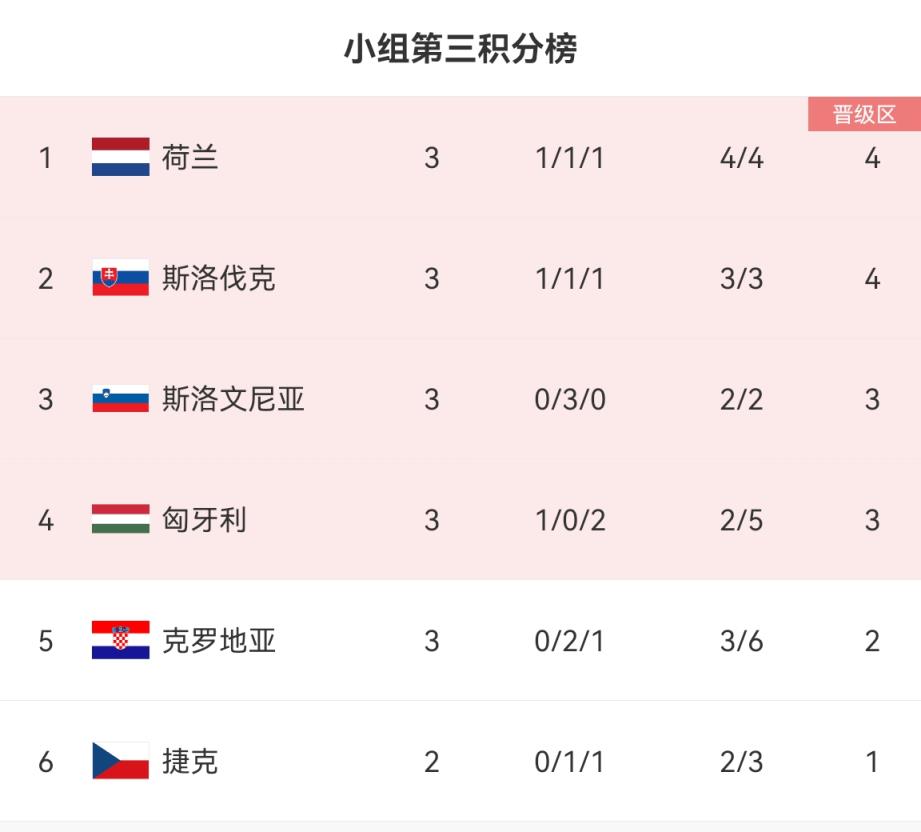 06月27日讯 欧洲杯结束5个小组的较量,还剩F组的比赛稍后进行。按照规则,6个小组的前二和4个成绩最好的小组第三出线,目前B组第三克罗地亚确定出局,且CDE的小组第三确定出线,那么小组第三的出线情况只剩下ACDE和CDEF两种可能。