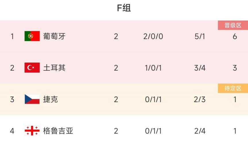在F组中,除了葡萄牙锁定小组第1,其他3队都有出局的危险。目前的情况,匈牙利、土耳其、捷克和格鲁吉亚将争夺最后2个16强的名额。