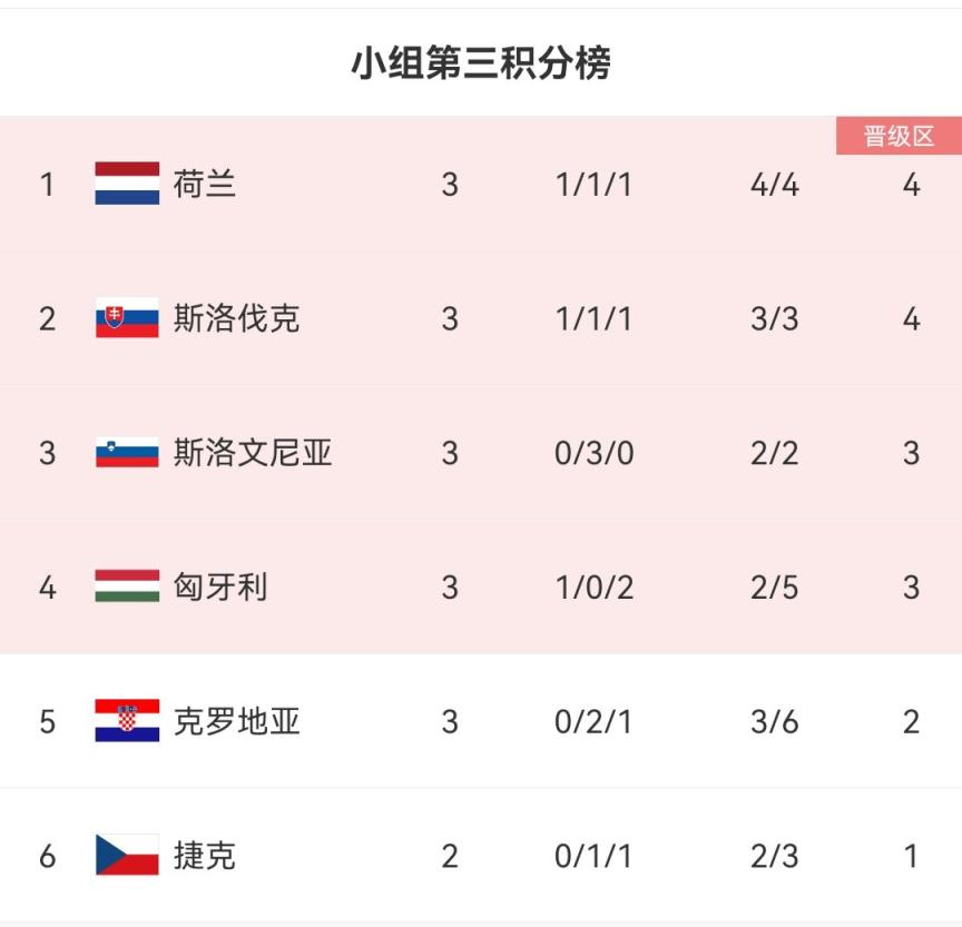 06月27日讯 欧洲杯小组赛仅剩F组两场比赛,目前的小组第三排名形势很明朗。荷兰、斯洛伐克、斯洛文尼亚锁定晋级名额,匈牙利等待F组最后赛果。
