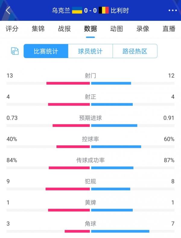 6月27日讯 欧洲杯小组赛E组第3轮,乌克兰0-0战平比利时,乌克兰垫底出局,比利时第二出线,全场数据如下。