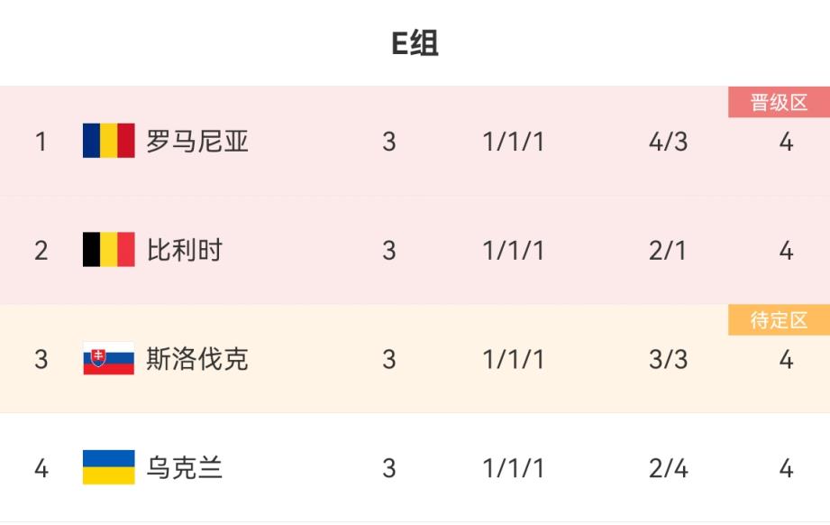最终这个组出现4队均为4分的奇景,最终罗马尼亚凭借进球数优势头名出线,比利时凭借净胜球优势次名出线,斯洛伐克成为成绩最好的4个小组第三出线,乌克兰4分惨遭淘汰。