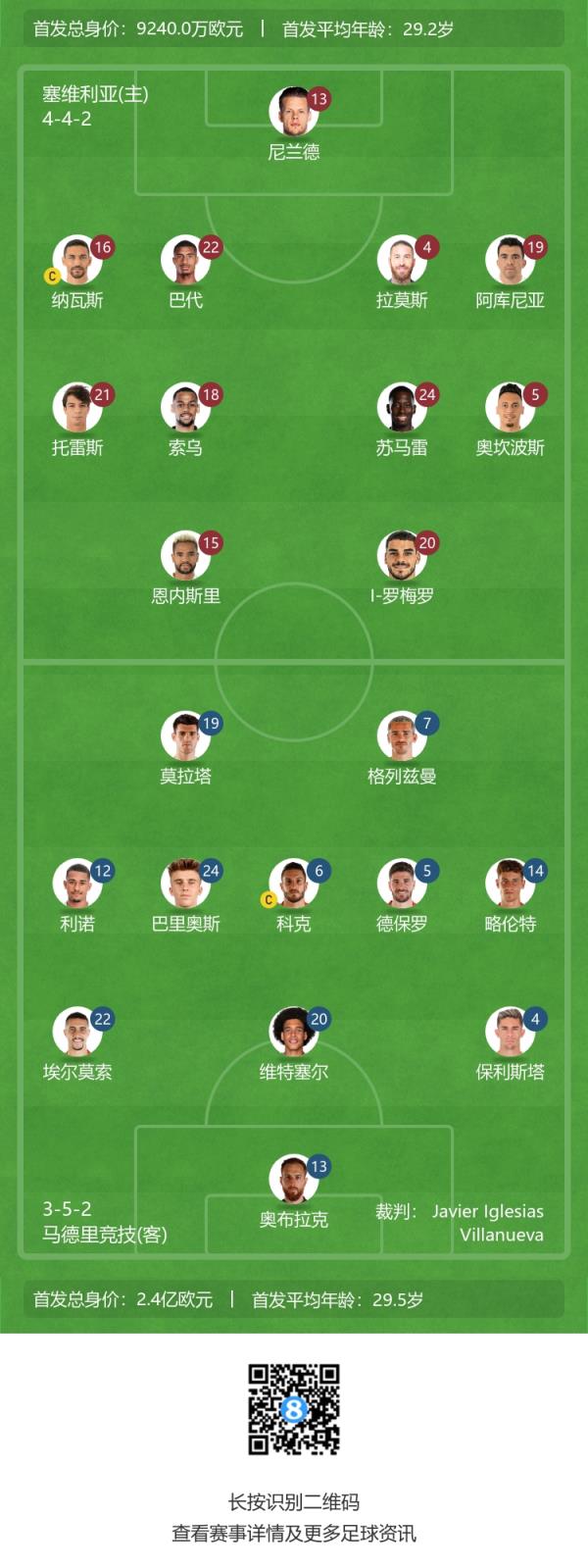 塞维替补:1-德米特洛维奇、33-马提亚斯-阿博尔、3-佩德罗萨、7-苏索、8-霍尔丹、17-拉梅拉、25-贾努扎伊、26-胡安卢、29-达里奥、38-奥尔米戈、41-伊德姆博、46-汉尼拔-梅布里