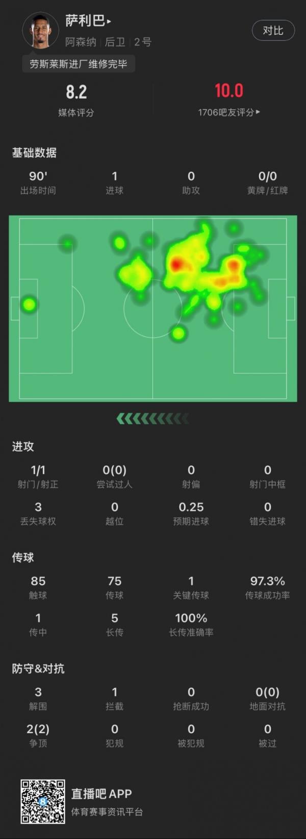 2月12日讯 英超第24轮,阿森纳客场6-0血洗西汉姆。本场比赛,萨利巴首发出战并打满全场,打进1球,获得Sofascore8.2的评分。