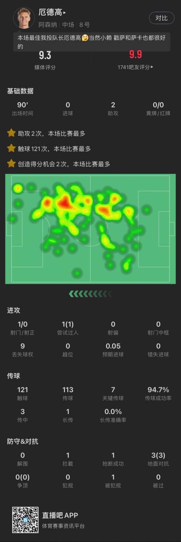 2月12日讯 英超第24轮,阿森纳主场6-0大胜西汉姆。本场比赛,小队长厄德高首发出战并打满全场,送出2次助攻,评分9.3全场第三高,仅次于萨卡和赖斯。