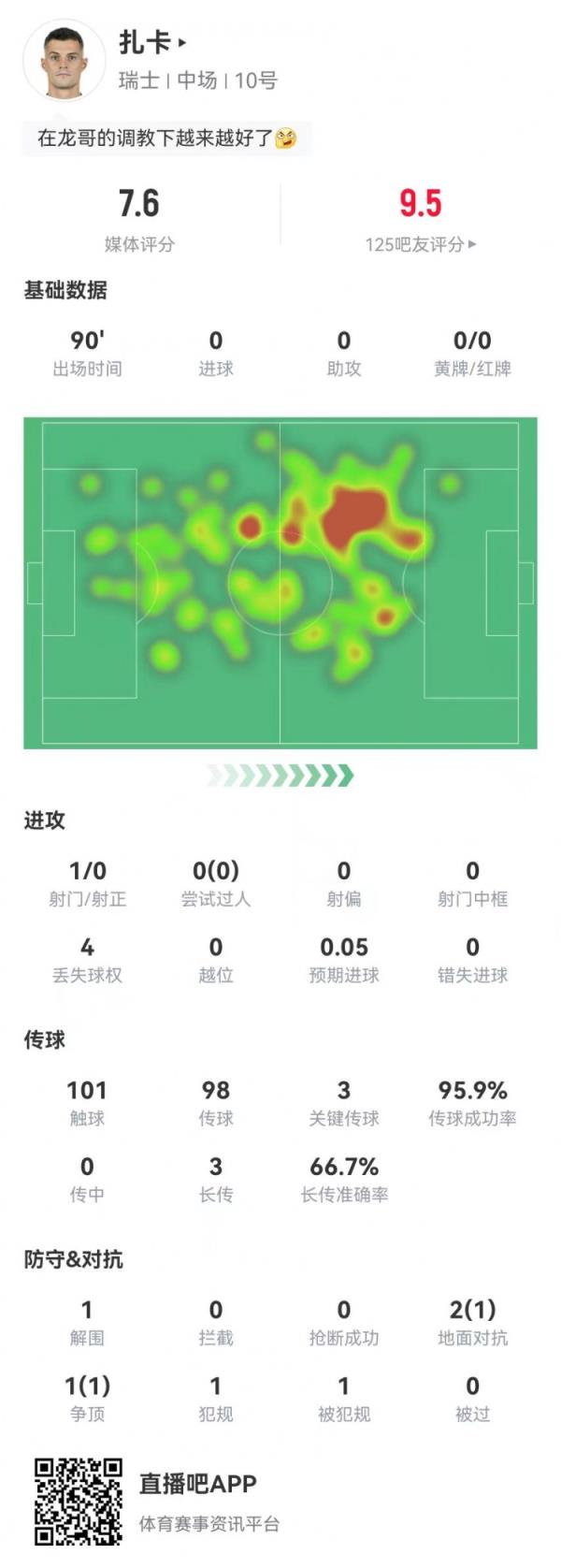 6月30日讯 瑞士在本轮欧洲杯2-0力克意大利,扎卡本场数据如下: