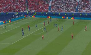 第37分钟,瑞士队攻势!左侧巴尔加斯传中!弗鲁勒跟进禁区里停球,左脚凌空爆射破门!意大利0-1落后瑞士!