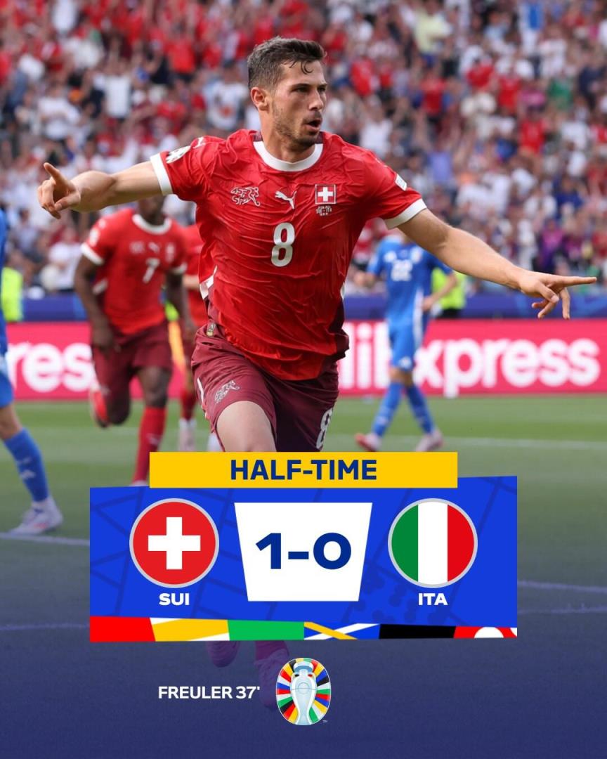 6月30日讯 北京时间0:00,欧洲杯1/8决赛首场较量,瑞士vs意大利。上半场,多纳鲁马扑单刀;弗鲁勒凌空破门!半场结束,意大利暂时0-1落后瑞士。