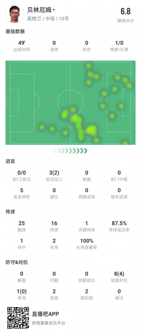 7月1日讯 欧洲杯1/8决赛,英格兰上半场0-1落后斯洛伐克,贝林厄姆半场数据如下。