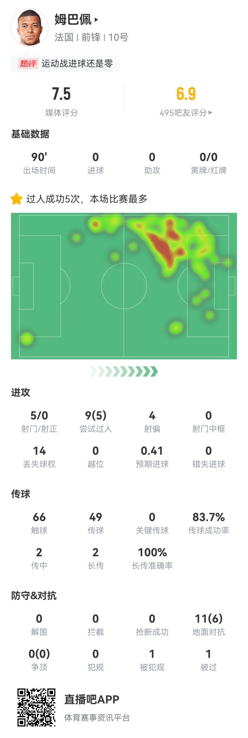 姆巴佩本场数据↓
