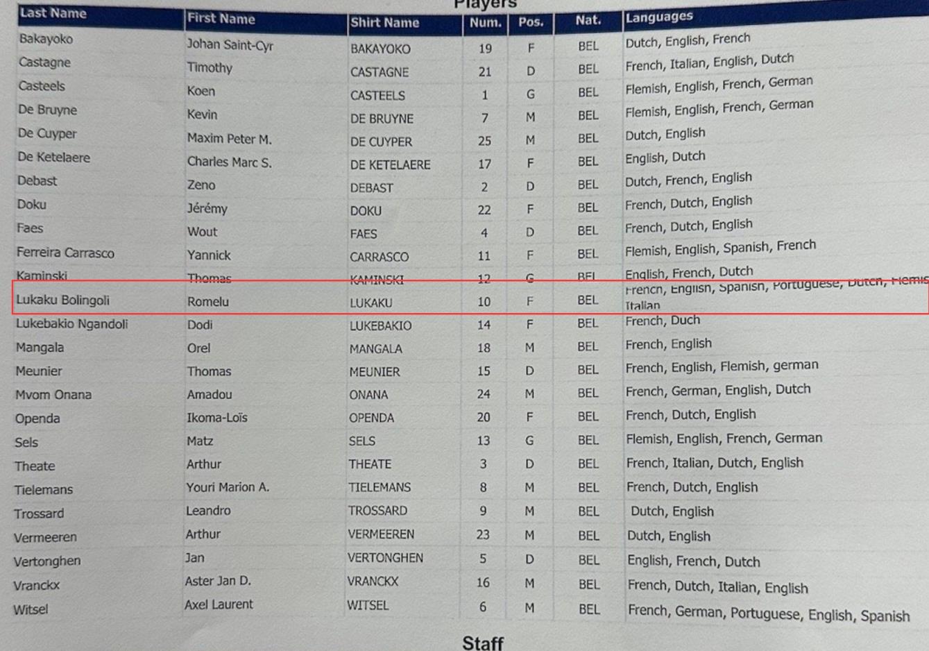 07月02日讯 根据微博博主DuduMassa晒出的球员语言表可以看到,卢卡库会说7门语言:法语、英语、西班牙语、葡萄牙语、荷兰语、弗莱芒语、意大利语。