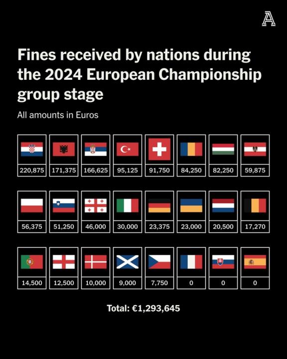 已有21个足协被欧足联罚款,共计1293645欧元,只有法国、西班牙和斯洛伐克还未被罚款。罚款主要与球迷行为有关,大部分是向球场投掷物品的违规行为,还有使用烟花等行为。