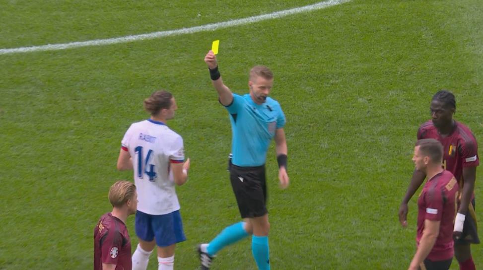 07月02日讯 欧洲杯1/8决赛,法国vs比利时。比赛第24分钟,拉比奥特铲倒多库被出示黄牌,法国若晋级前者将停赛。这是法国本场比赛吃到的第3张黄牌。